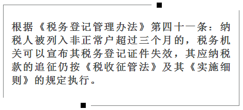 举个例子:例如A公司出现了税务逾期,并且税局通过其登记的地址和电话联系不上相关人员,那么这家公司就会成为“非正常”状态;如果持续“非正常”状态3个月,相关人员还没有来处理,那么税务机关就会宣布A公司税务登记证件失效,并且对其进行非正常注销。