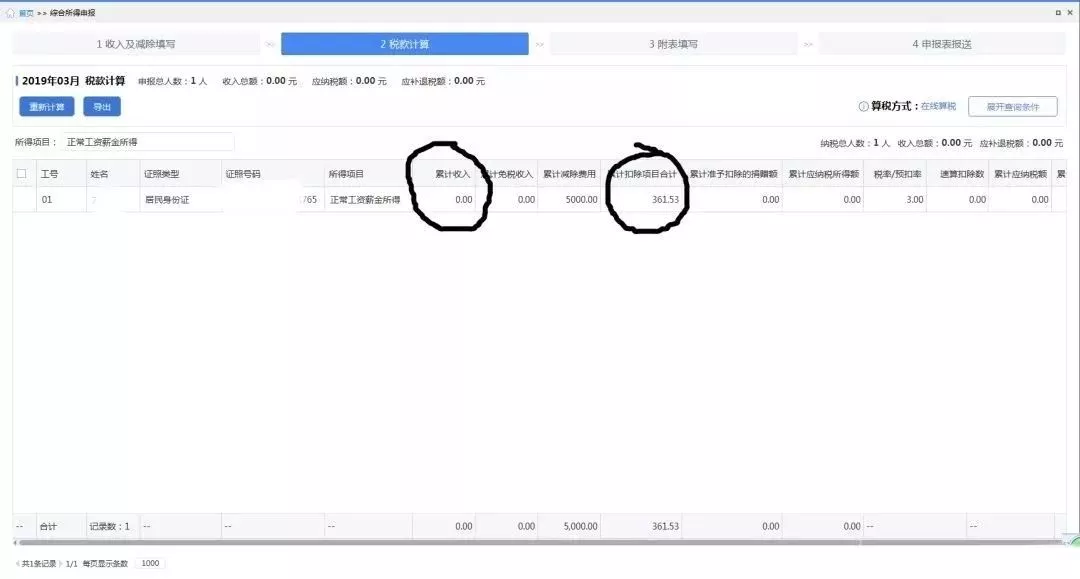 因此,企业在为该员工进行工资薪金所得个人所得税扣缴申报时,其“累计收入”为企业“上月为其申报的收入数+361.53元”;如果员工是第一个月入职,则其”累计收入“为361.53元。